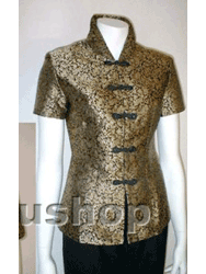 description: Black brocade, round bottom, little drag sleeves, widen piping in the front opening, single line buttons