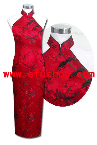 Description: improved silk tapestry satin cheongsam dress, white red with black plum blossom fabric. Mandrain collar with black piping and branch buttons at front piece. Side zipper. Specail piping. Expost shoulder and back, ankle length. Double slits.