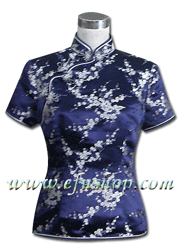 description: Black with black plum blossom silk tapestry satin fabric, short sleeves, standing collar, use another kind of fabric with dragon attched to bottom of the collar. Grape button, yellow piping.